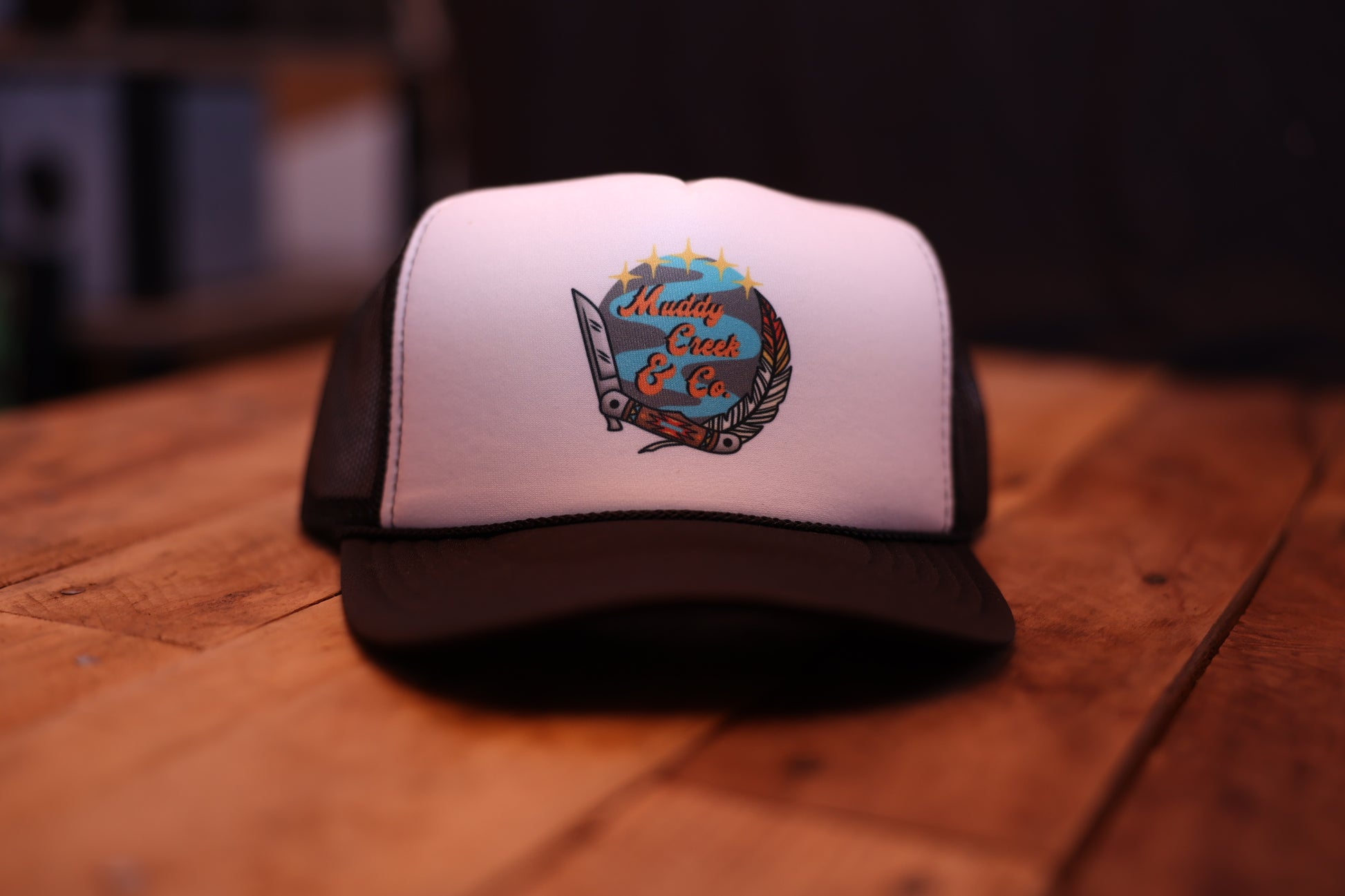A high quality Trucker hat with Muddy Creek & Co's 2nd gen "Knife & Feather" Logo